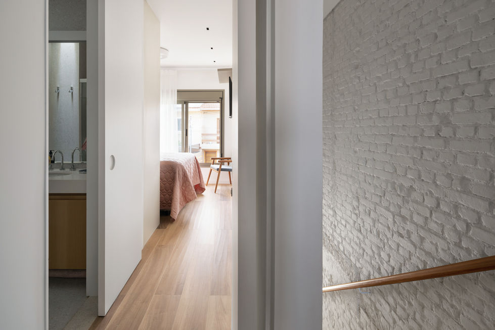 O andar superior foi reconfigurado para receber duas suítes. Os banhos foram projetados com iluminação zenital e ventilação permanente. Na cobertura, foi posicionado um escritório, que se abre para um solário que dá vista para o Ginásio do Ibirapuera.
